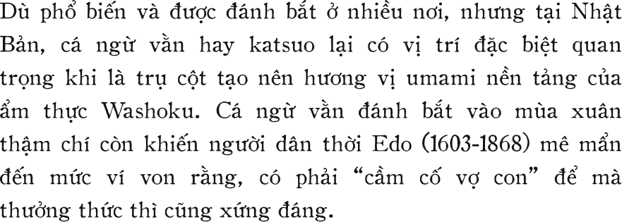 Nói một chút về nguồn gốc cái tên katsuo, cá ngừ vằn ban đầu được gọi là “堅魚 – katauo” (cá cứng), sau đó biến âm thành “katsuo”. Hán tự “鰹” thường dùng cho katsuo chính là ghép lại từ hai chữ “堅魚” trên. Ngoài ra, còn có cách viết mang ý nghĩa cầu may là “勝魚”, nghĩa là “cá chiến thắng”, do “katsu” cũng đồng âm với từ chiến thắng trong tiếng Nhật. Cũng vì lý do này mà vào thời Edo, cá ngừ vằn được ưa chuộng như một lá bùa may mắn, đặc biệt là đối với các samurai.